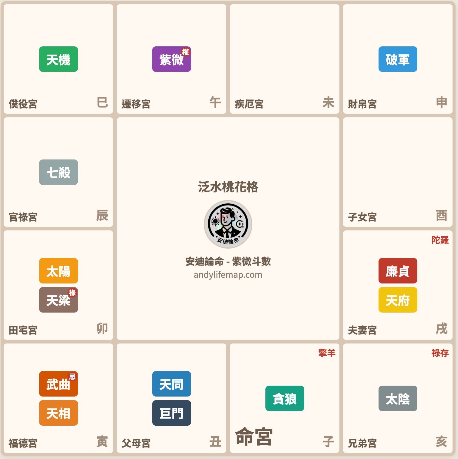 然而,這個格局的問題在於內在與外在的矛盾。外表看起來社交能力強、桃花旺盛,但內心卻因福德宮的武曲化忌而充滿不安全感。加上夫妻宮的陀羅星帶來的糾結特質,讓當事人在感情中變得既想要又放不下,遇到對象之後會不斷質疑對方是否合適。