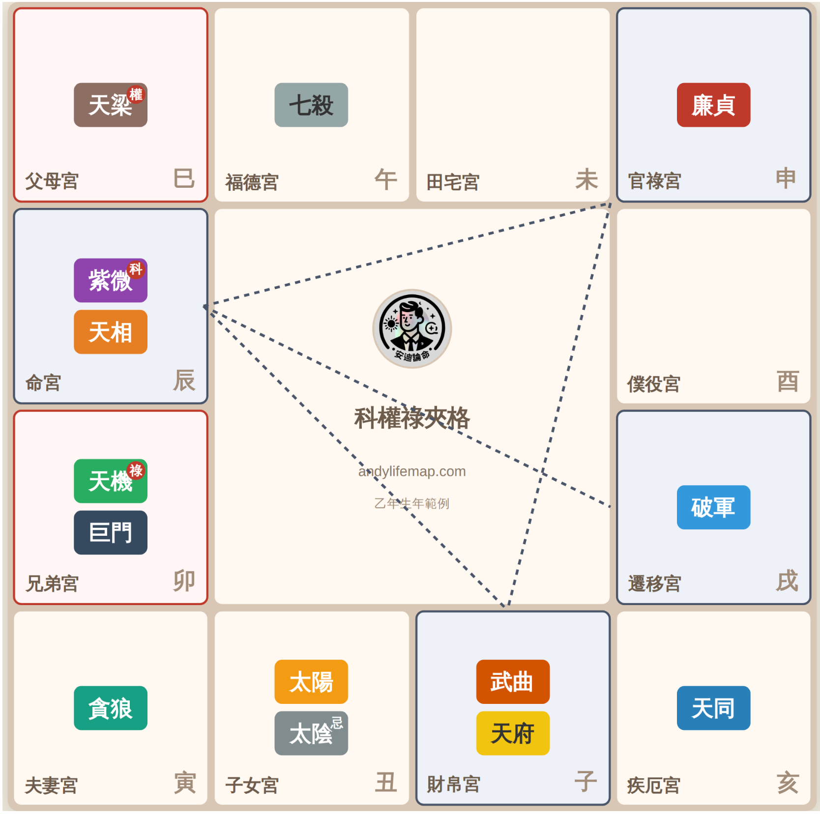 然而真正需要警惕的,反而是命宮自身的強弱。科權祿夾格給的是外部的支撐力道,而非命主本人的能量,如果三方四正的星曜過於軟弱,或煞忌過多,外部資源再好,也只是補了一個漏水的桶子。