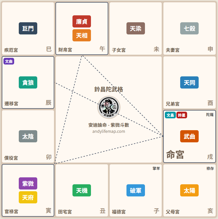 鈴星最危險的組合之一。武曲是財星、文昌是規矩、鈴星有算計、陀羅是想不清楚,加在一起就是一個容易在規則上反覆但又思考不清破壞規則最後破財的組合,情緒也會相當起伏不定。