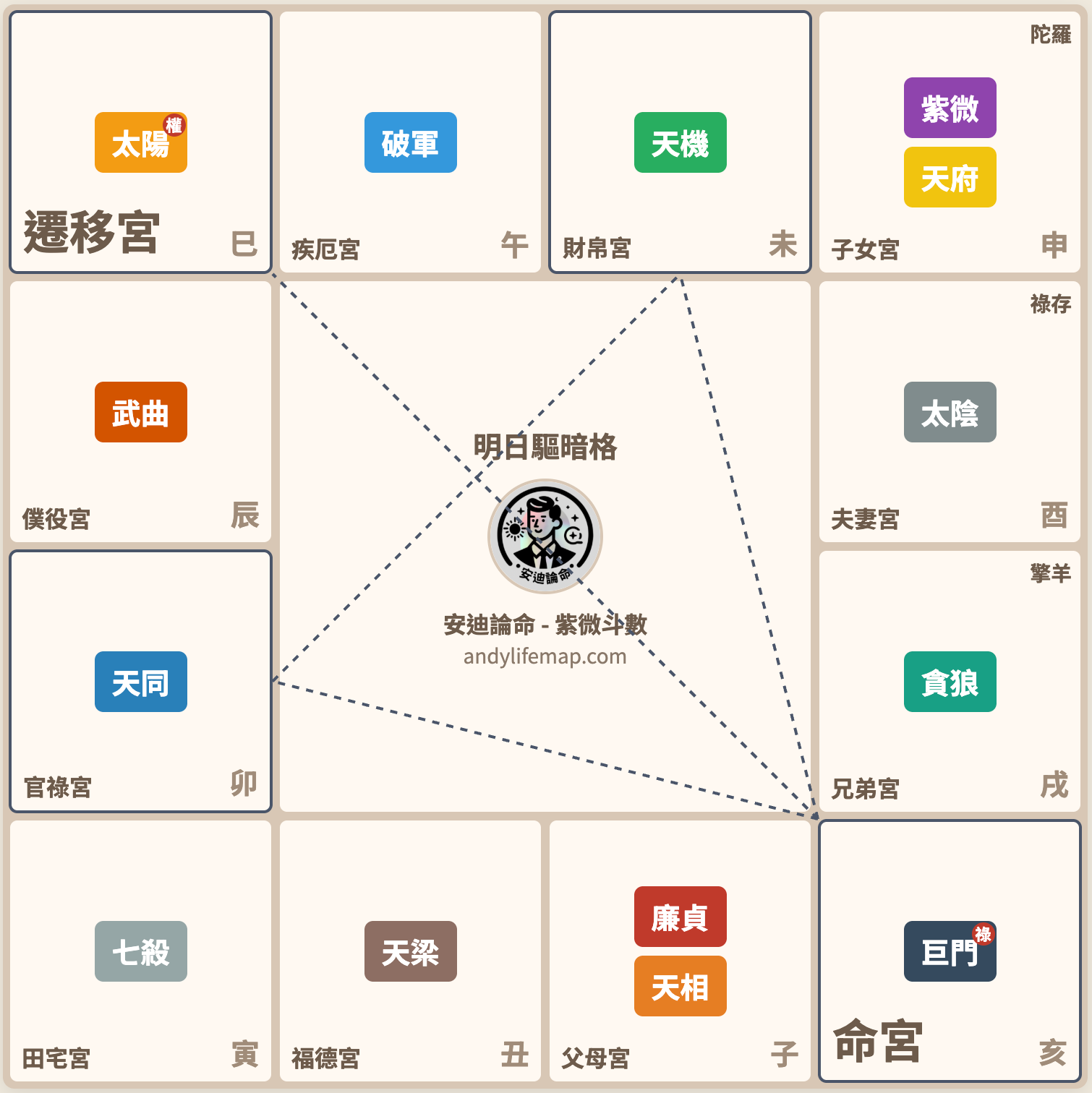 巨門星坐命於亥位,太陽星在巳位來照命宮,是明日驅暗格的正格條件。