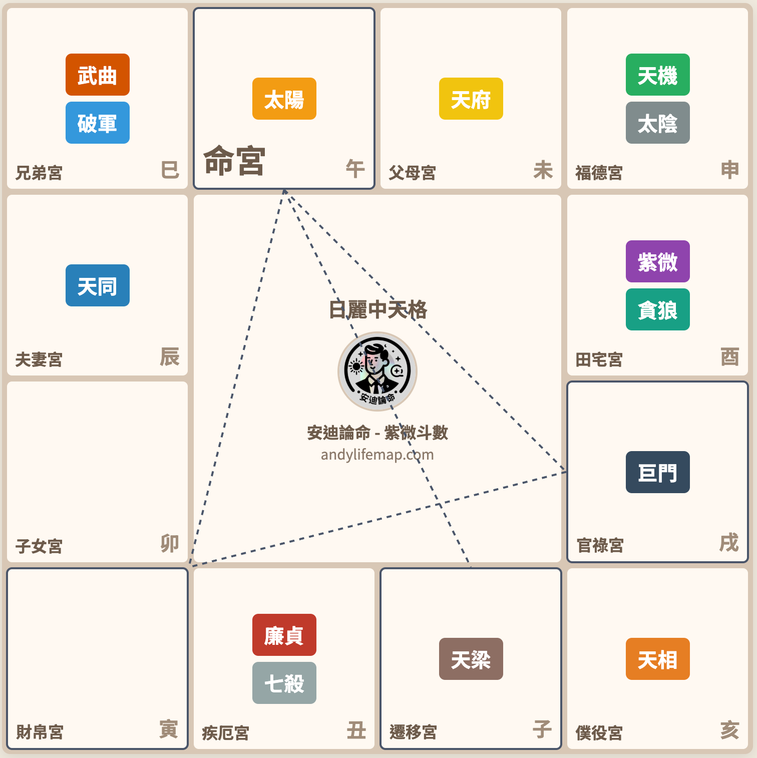 日麗中天格是太陽星在午位坐命的格局,午位為太陽光芒最強的時刻,造就霸道總裁般的強勢性格。配合左輔右弼天魁天鉞等吉星,能發揮專權之貴。本文深度解析成格條件、古文詮釋與注意事項,助你掌握這個追求權力與聲望的特殊命格。