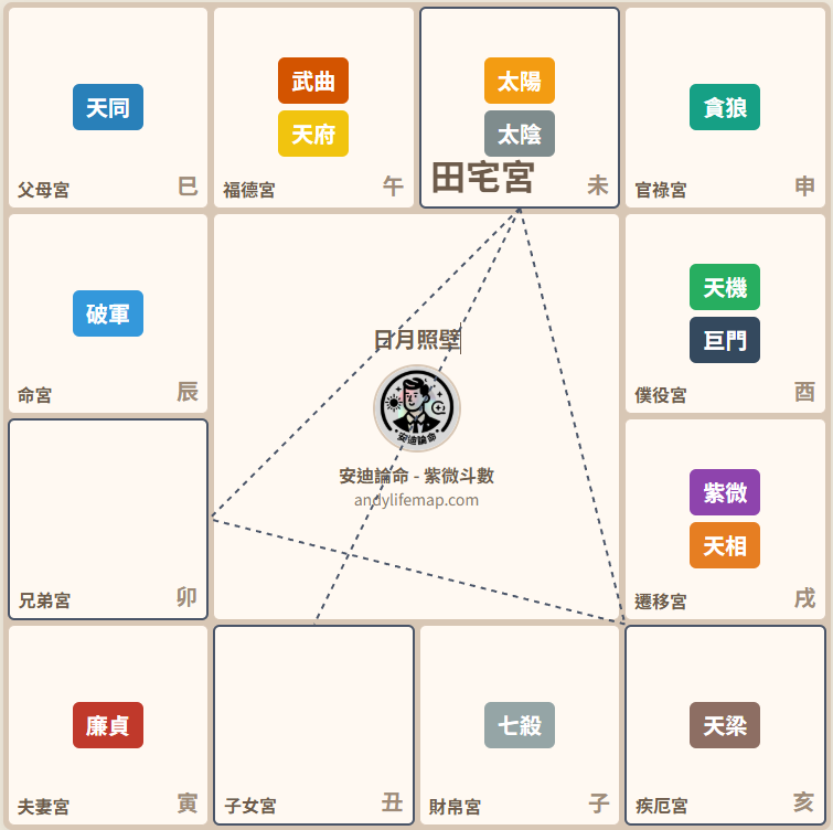 太陽星與太陰星同宮坐田宅宮,必落在丑宮或未宮位置。這是紫微斗數中少數以田宅宮為核心的特殊格局,不同於一般格局著重命宮或財帛宮的配置。