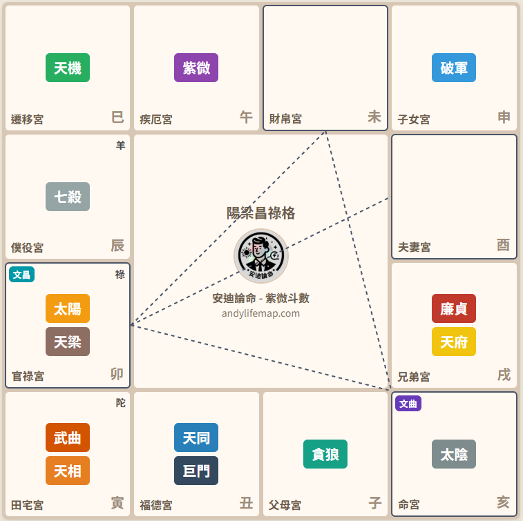 太陽跟天梁,到時候如果擺在官祿宮,或者是運限命宮,逢文昌,並且遇到太陽化祿、天梁化祿,或者是祿存時(三個祿有一種就算), 就會形成陽梁昌祿格。是個考試考得好,公司裡面特別容易升官的格局。