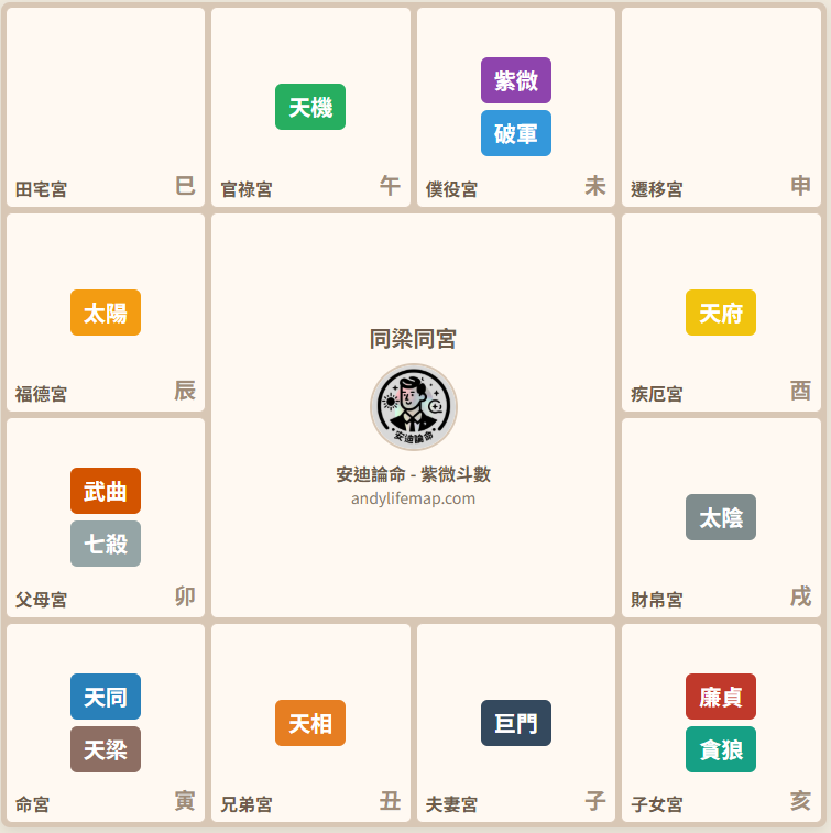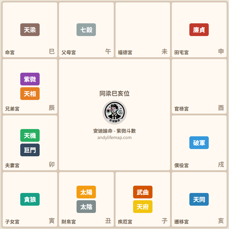 天同天梁在巳亥位對拱,是紫微斗數命盤中特別快樂的組合。