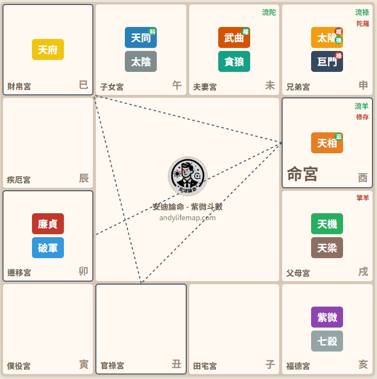 這個格局特別容易在庚年時被引爆,因為庚年會讓天相星化忌,形成刑忌夾印的危險組合。當化忌的力量加入時,原本就被煞星夾著的天相星會變得更加不穩定,很容易讓當事人在法律規範方面出現重大疏失。