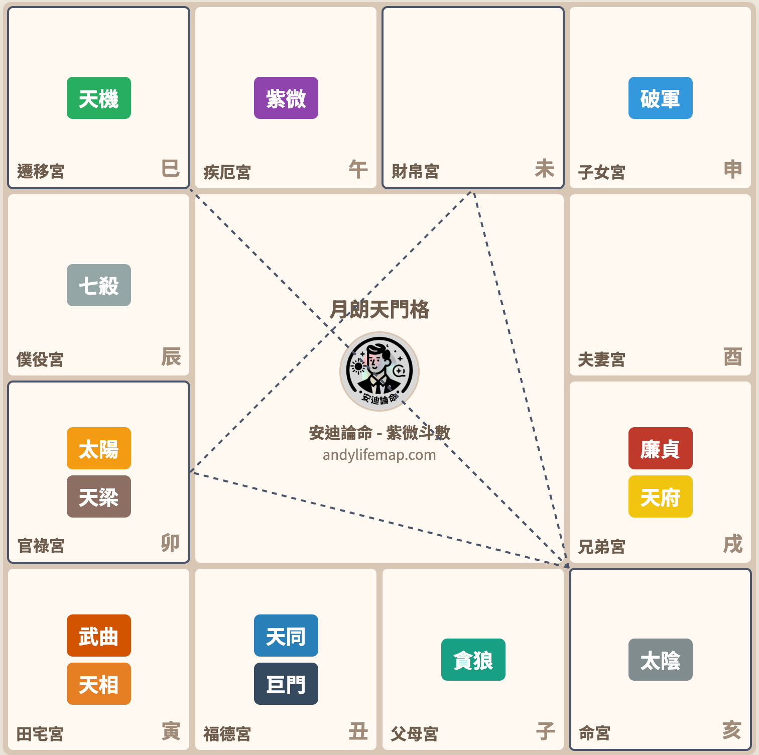 月朗天門格是太陰星在亥宮坐命的好格局,對宮為天機星。此格局的人細心照顧他人,邏輯思維清晰,工作上成熟穩重又能領導,非常符合古人喜愛的特質。若官祿宮同時擁有陽梁昌祿格則更佳。本文詳解成格條件、性格特質與現代應用。
