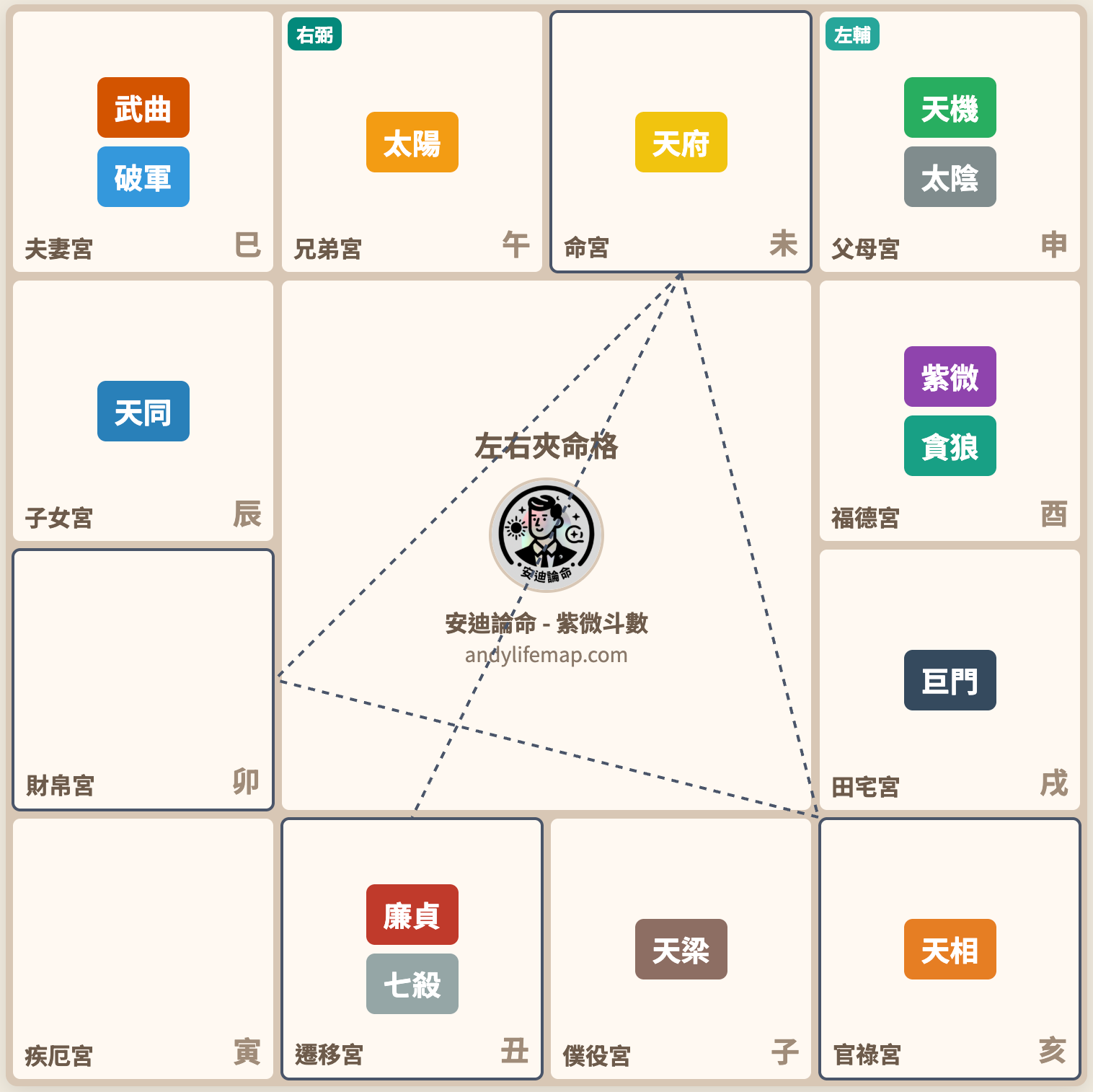 這也是為什麼論命時不能只看「有沒有左右夾命格」,更要細看夾宮的星曜組合。甚至是整體命盤的三方四正狀態才是決定這份助力品質的真正關鍵。夾宮若擺了性質穩重的星曜,再搭配左輔右弼夾命,才是真正能夠發揮格局效益的完整條件。